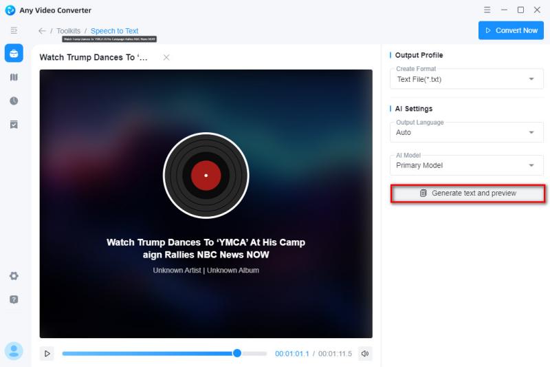 After all settings are completed, you can click the "Generate text and preview" button to check whether the transcription is accurate. If you are satisfied with the result, you can click the "Convert Now" button in the upper right corner to start converting the speech to text.