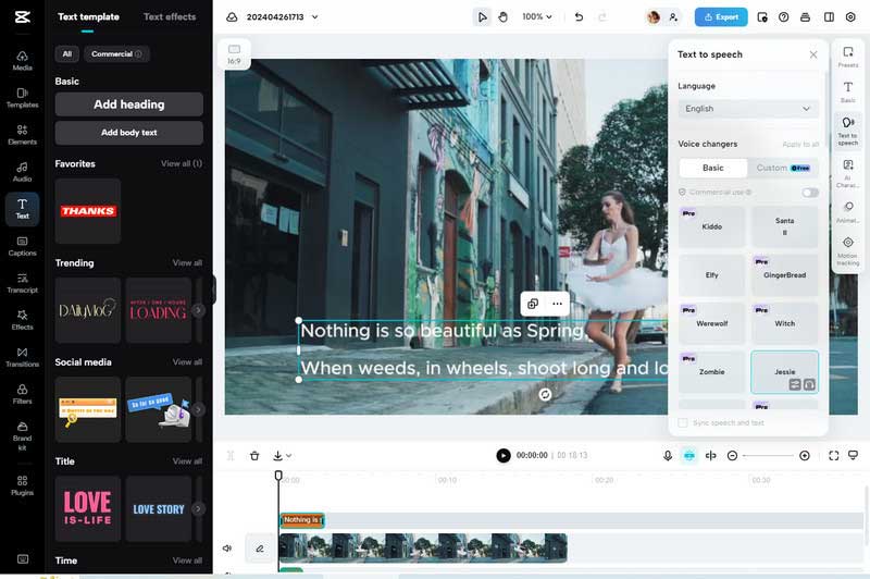 Step 1. Simply upload a video to CapCut, and add body text to the video, then click the "Text to Speech" option from the right panel of the interface. After that, select the language and voice changer, and tick off the "Sync speech and text" option.