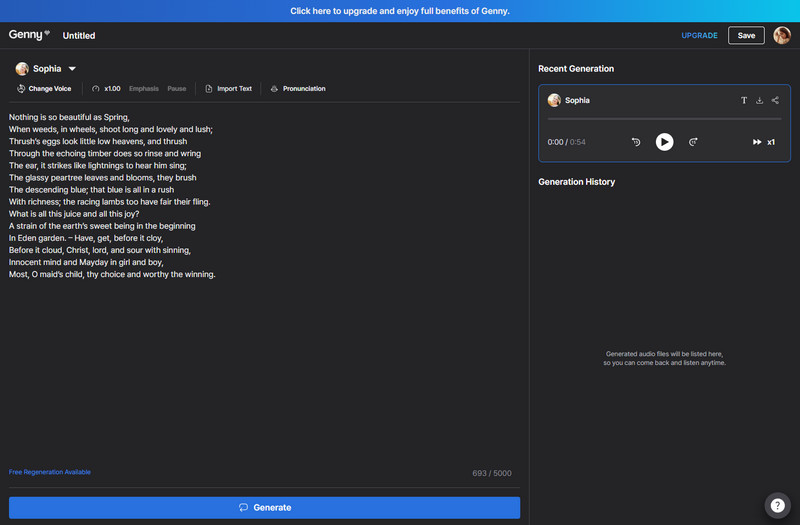 Step 3. Type or copy and paste the text, then select the voice gender, age, and use case. Users are allowed to add the pauses, emphasis, pronunciation. After all the settings are done, click the "Generate" button.