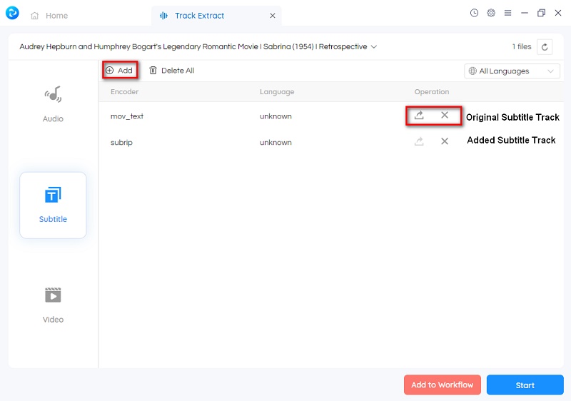 The Track Extract tool serves the dual purpose of adding and ripping subtitles. Once uploading a video, the program automatically analyzes it, separating video, audio, and subtitle tracks. Select the track you want to edit, here take the Subtitle track as an example: